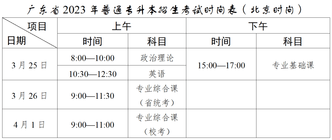 (四)普通专升本招生考试时间为2023年3月25日(星期六)至26日(星期日)两天,具体安排见下表: